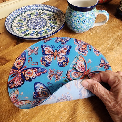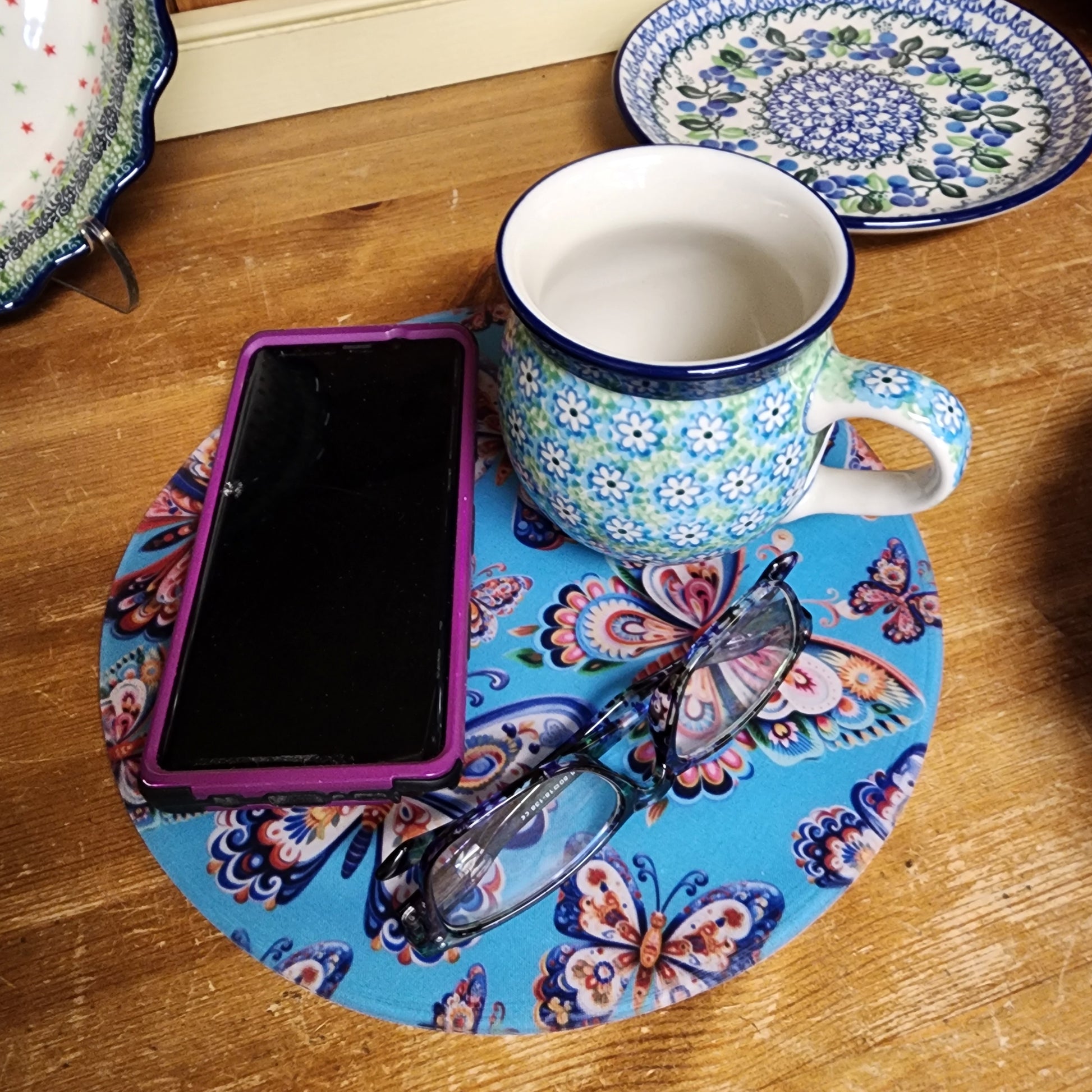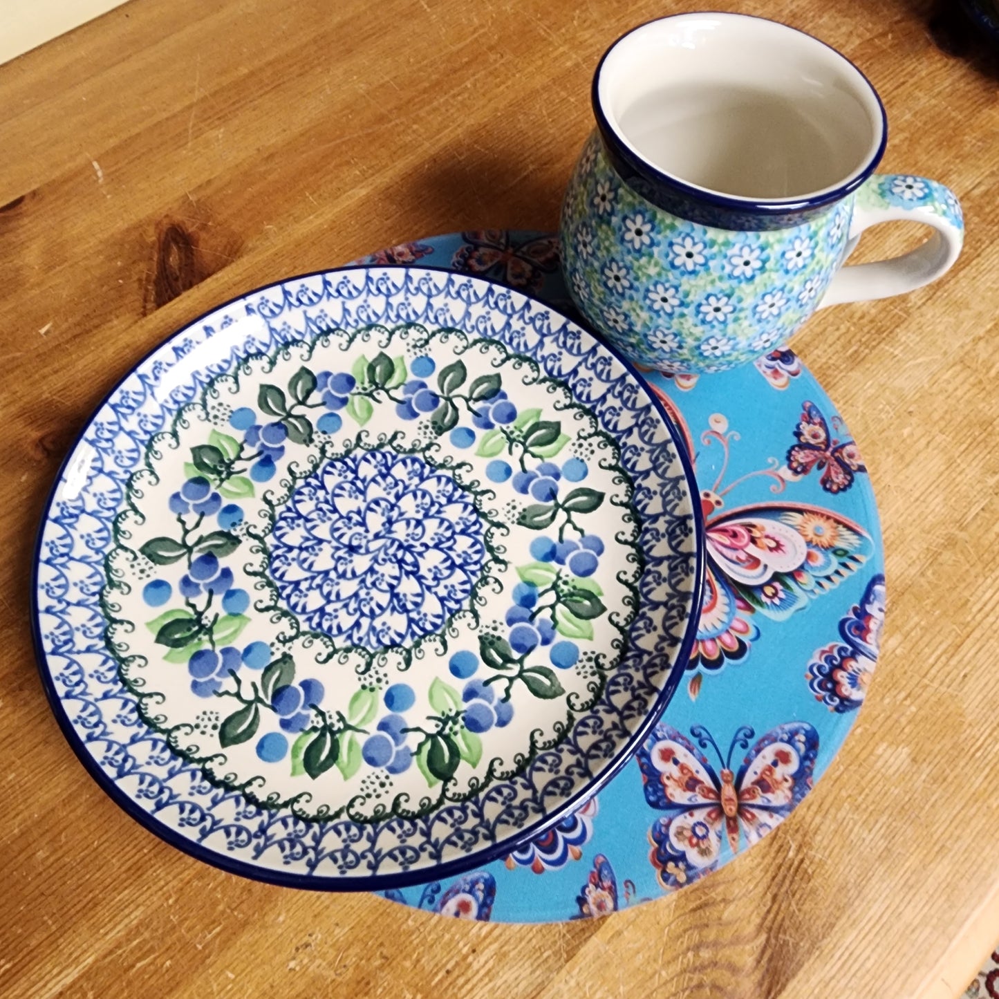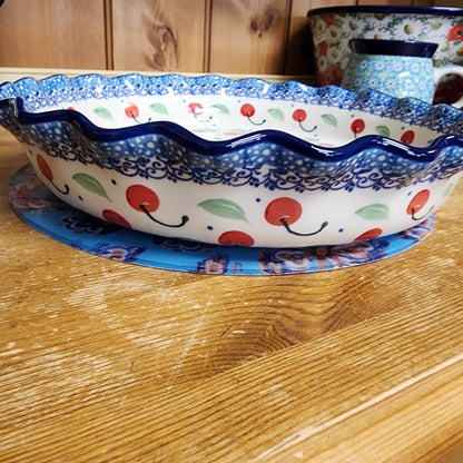 Microwave & Dishwasher safe / place on the glass turntable in microwave for a nice, clean look. Easy to take out to wash and eliminates "clunking" pottery on the glass.