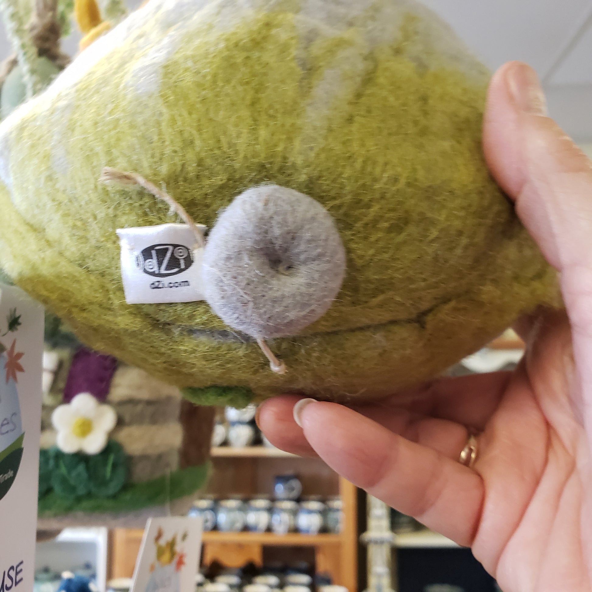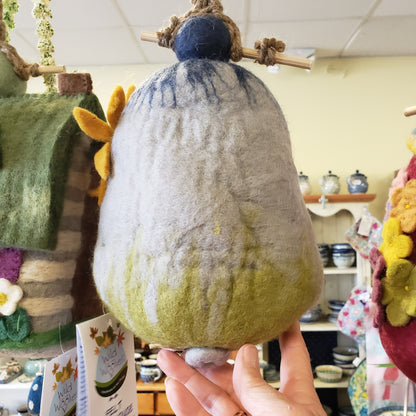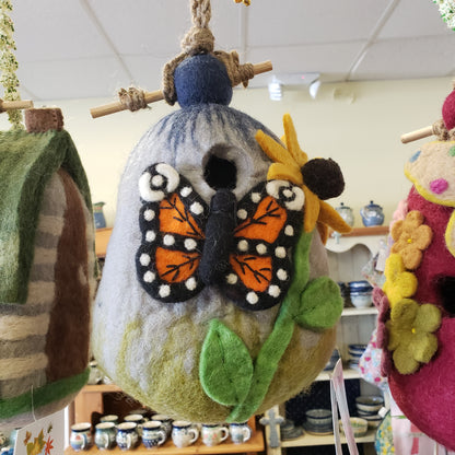 Decorative birdhouse can be hung indoors or outside in a a protected area (on a porch) where wrens like to nest. They love the wool fibers for nesting.