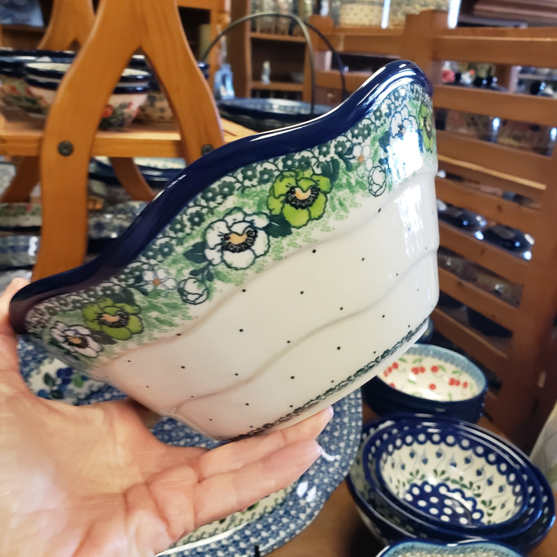 Polish Pottery Bowl Wavy Edge Medium 10" 2320X ~ Green Poppies PF1024