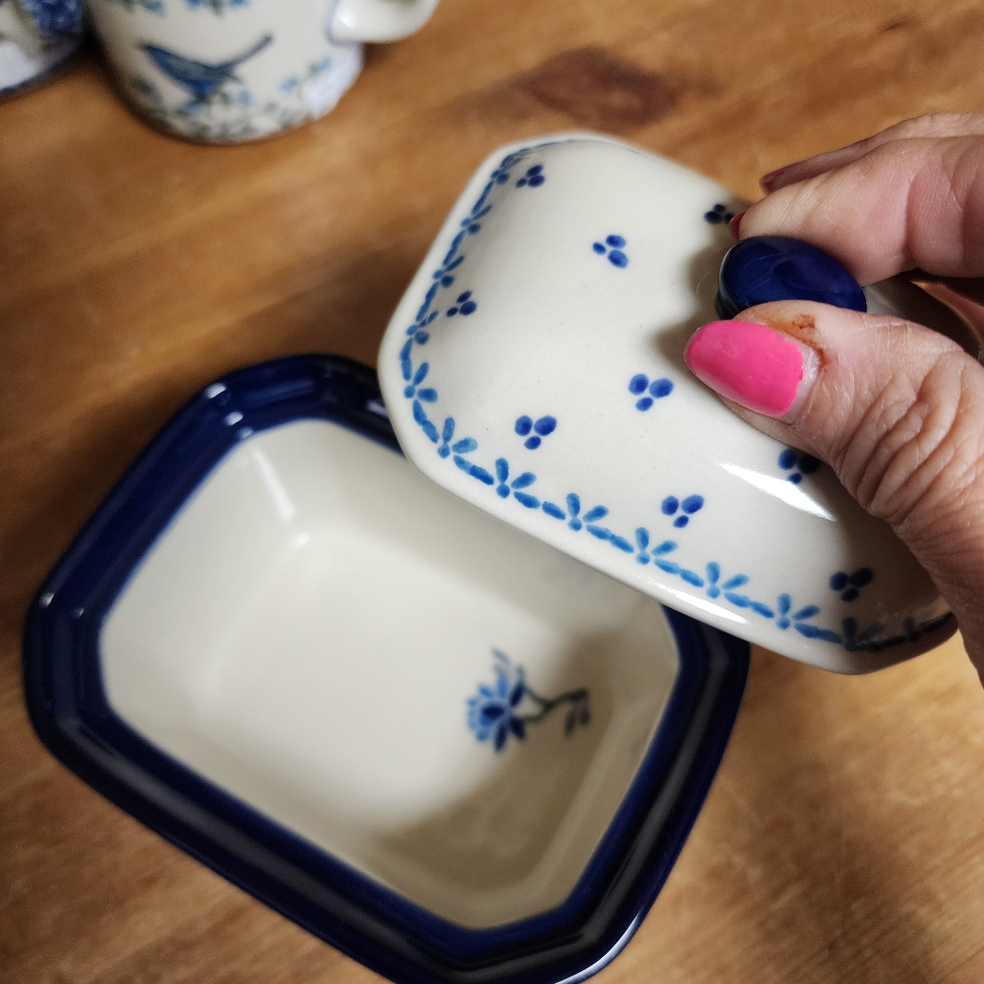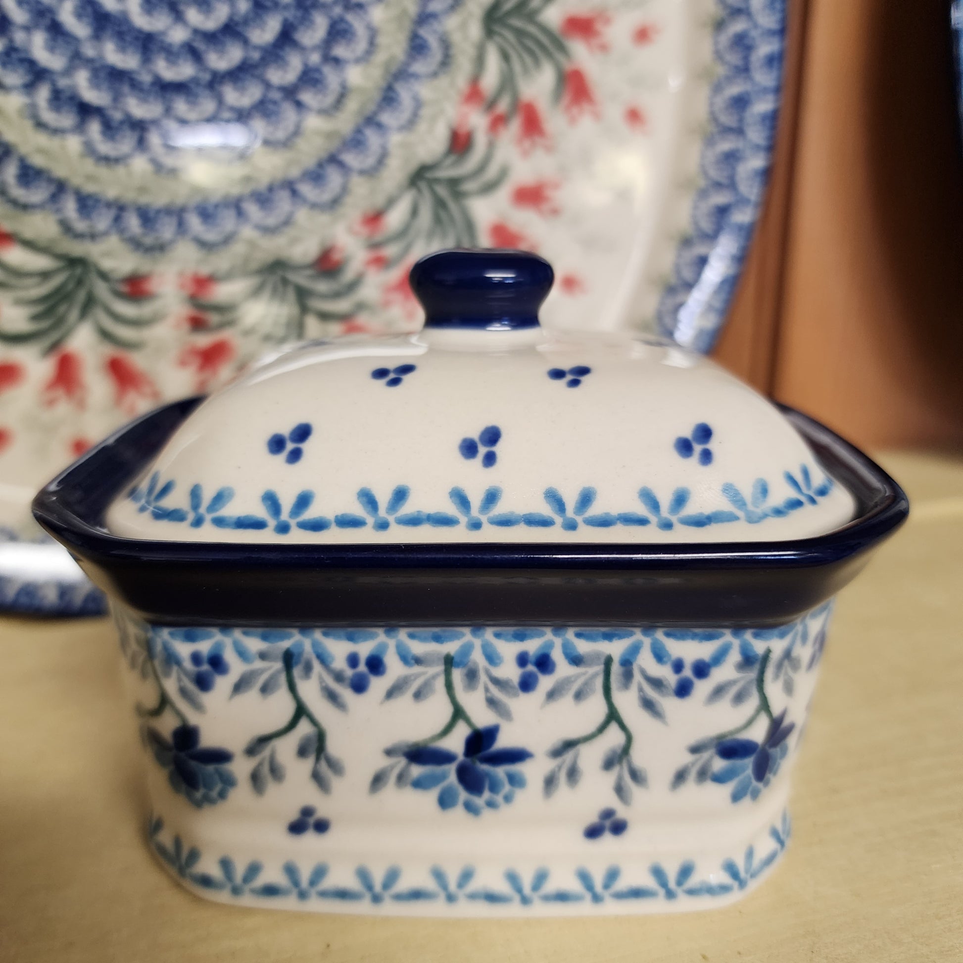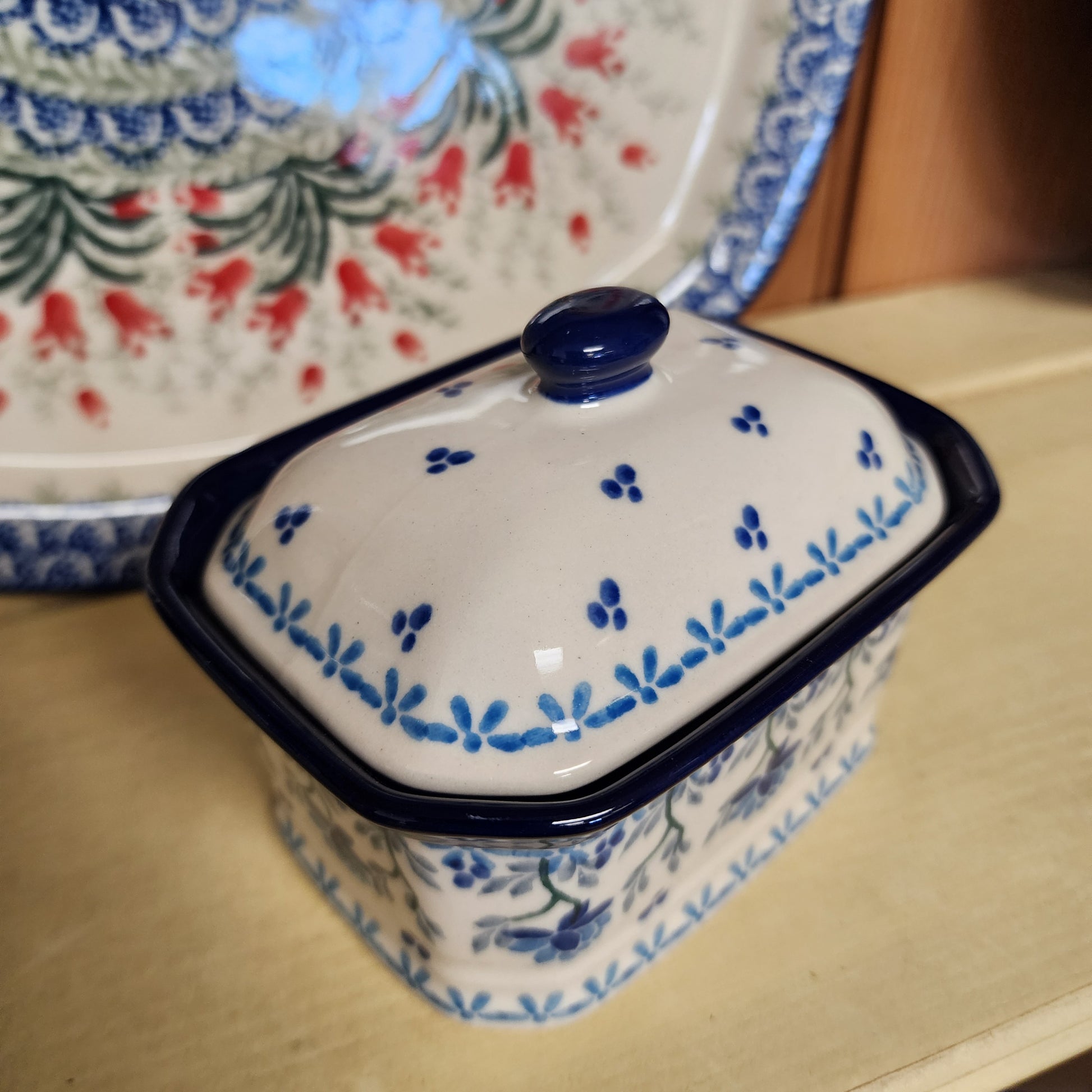 Polish Pottery Covered Container ~ 3.25"H x 3.5"W x 4.5"L 385-2524X pf0425