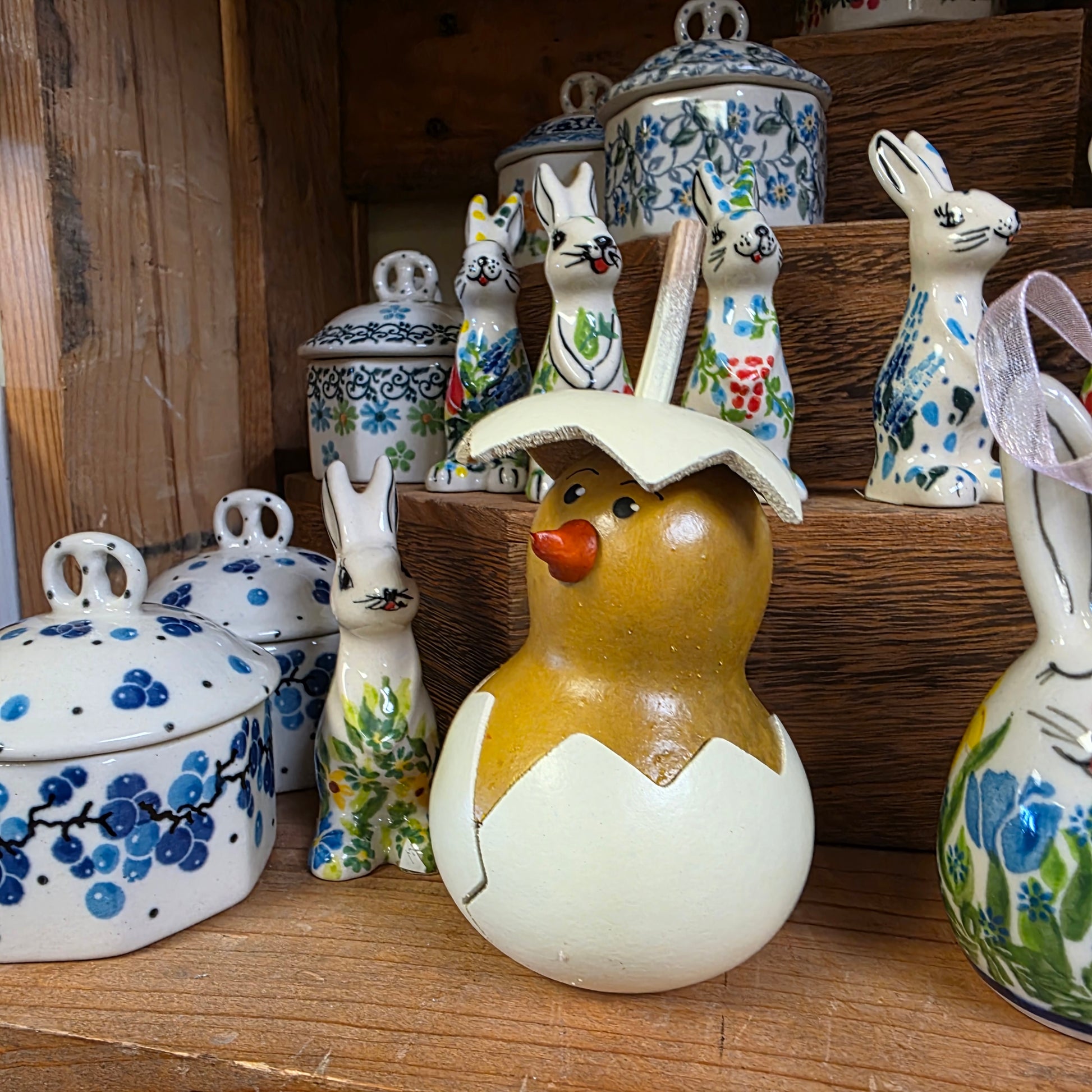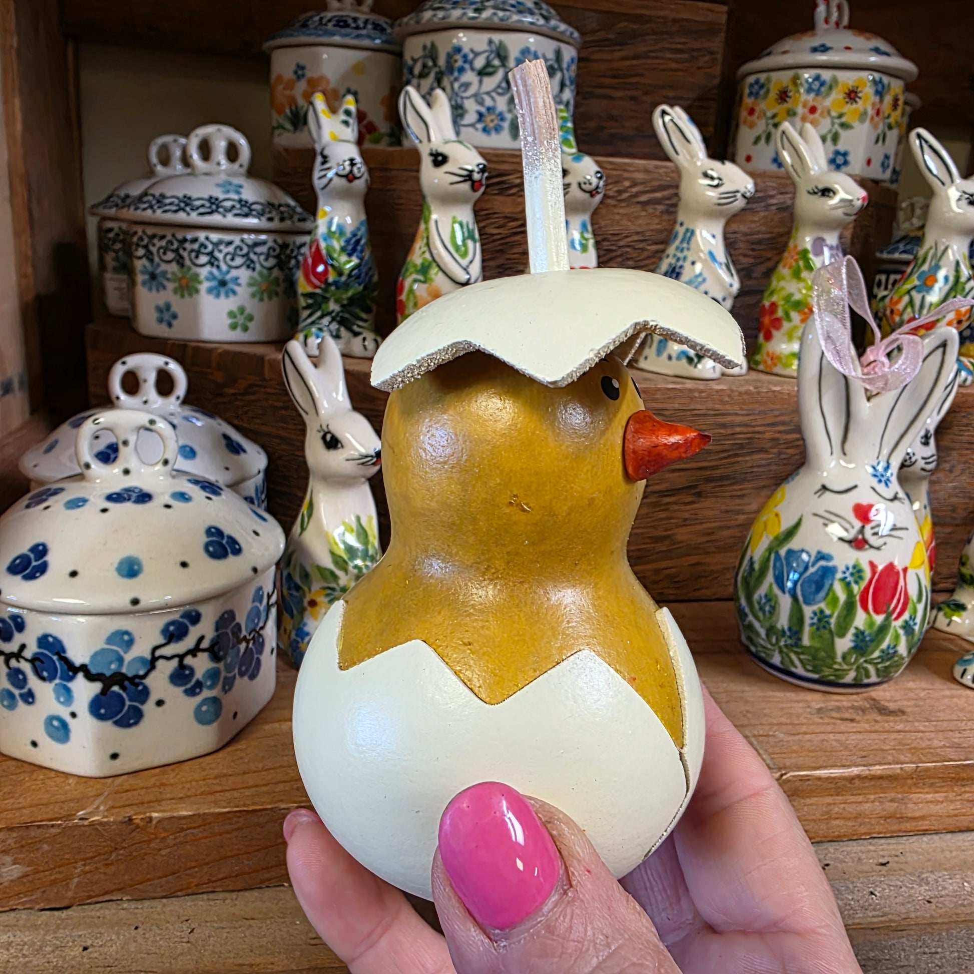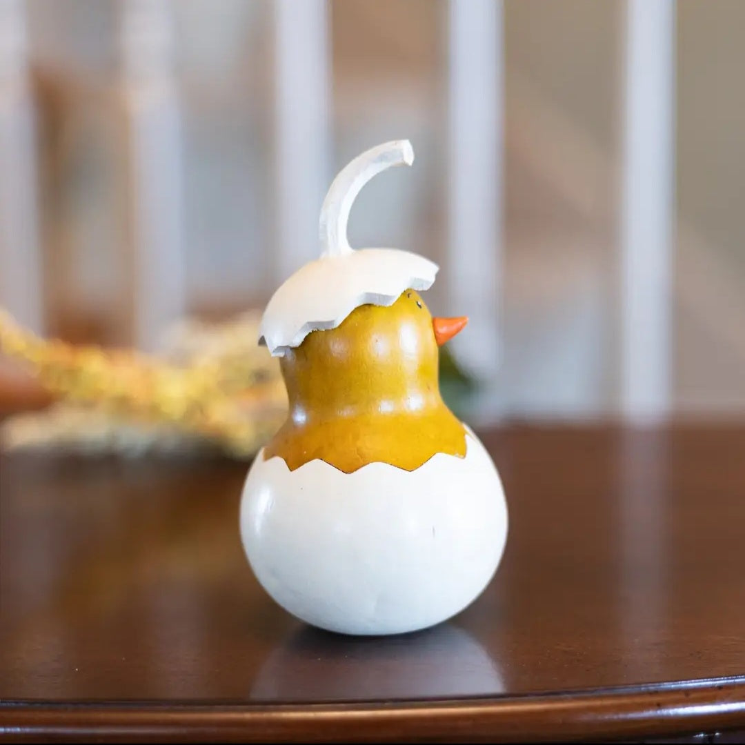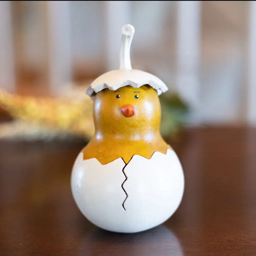 Flora has a yellow face with a white bottom that makes her look like she is hatching out of an egg. She is handcrafted with a handmade clay beak. * Approximately 2 1/2” in diameter and 4 1/2" tall.