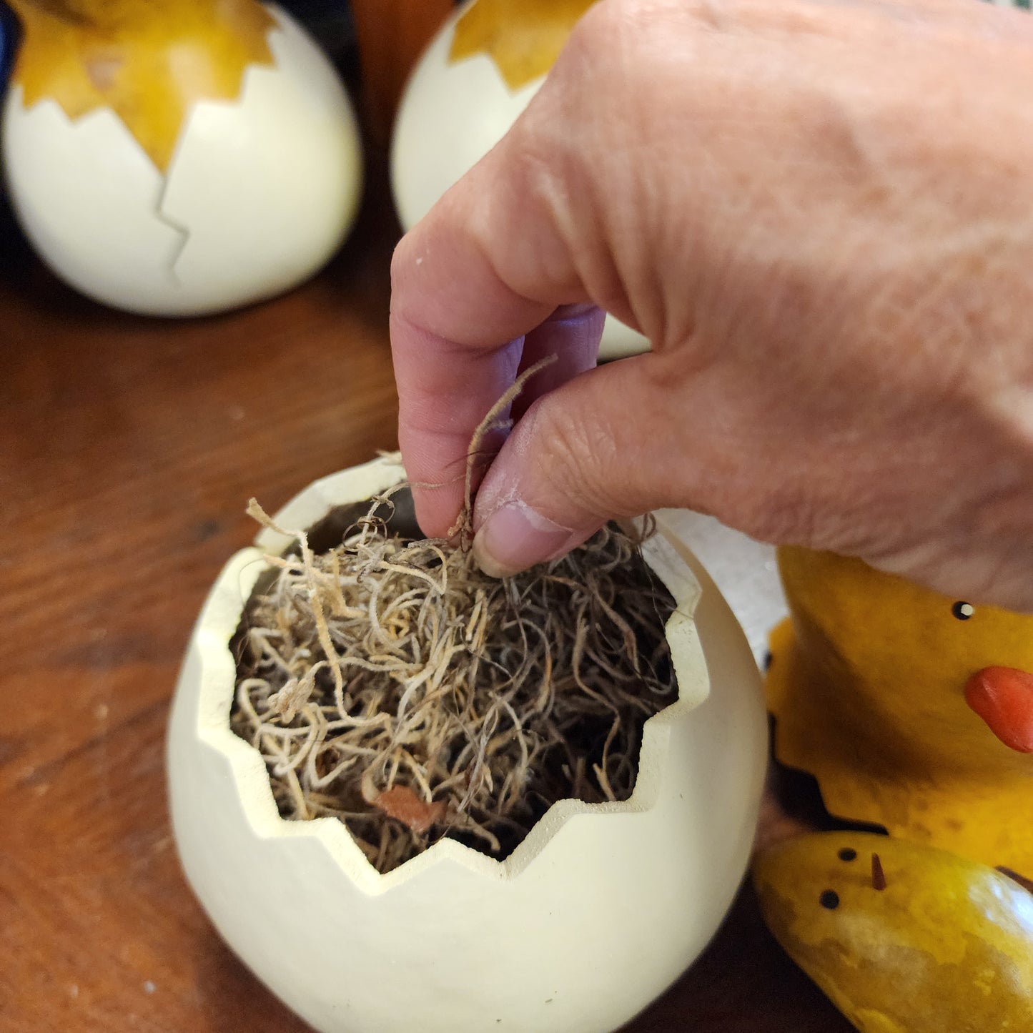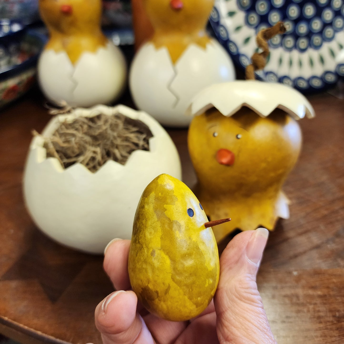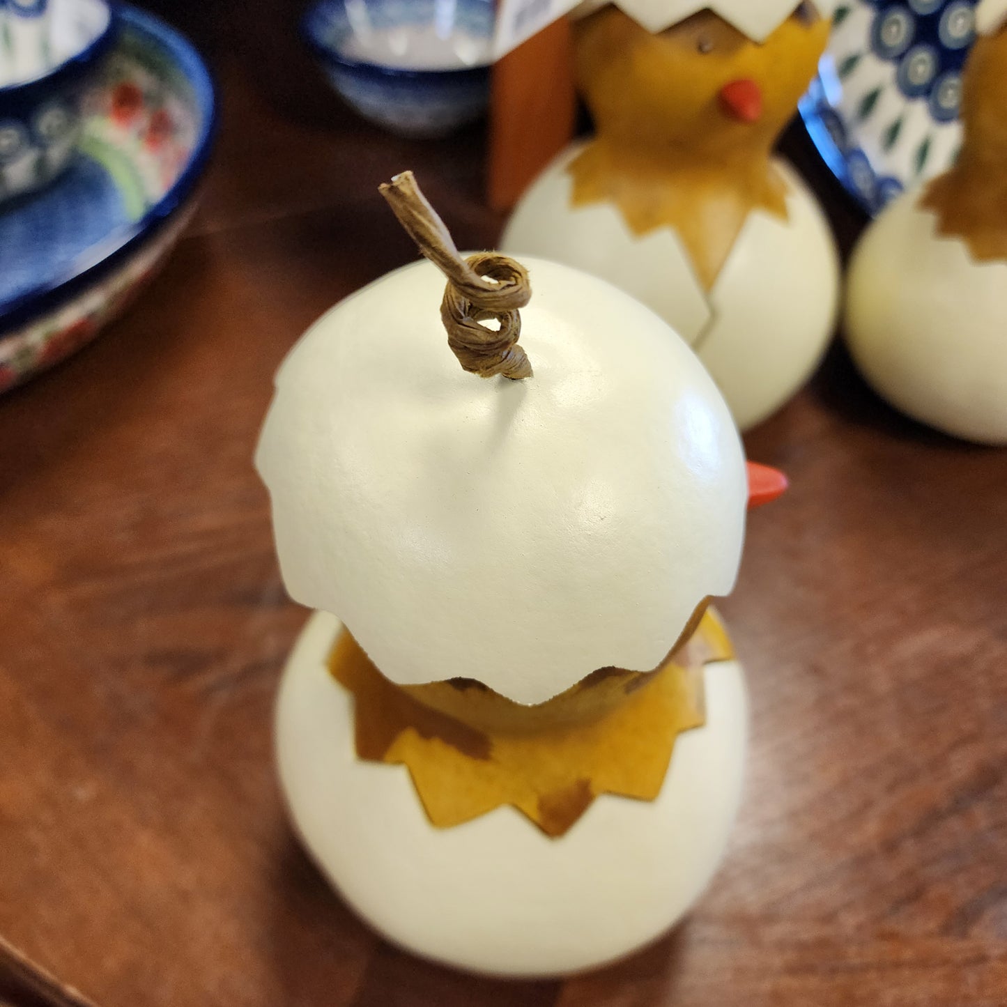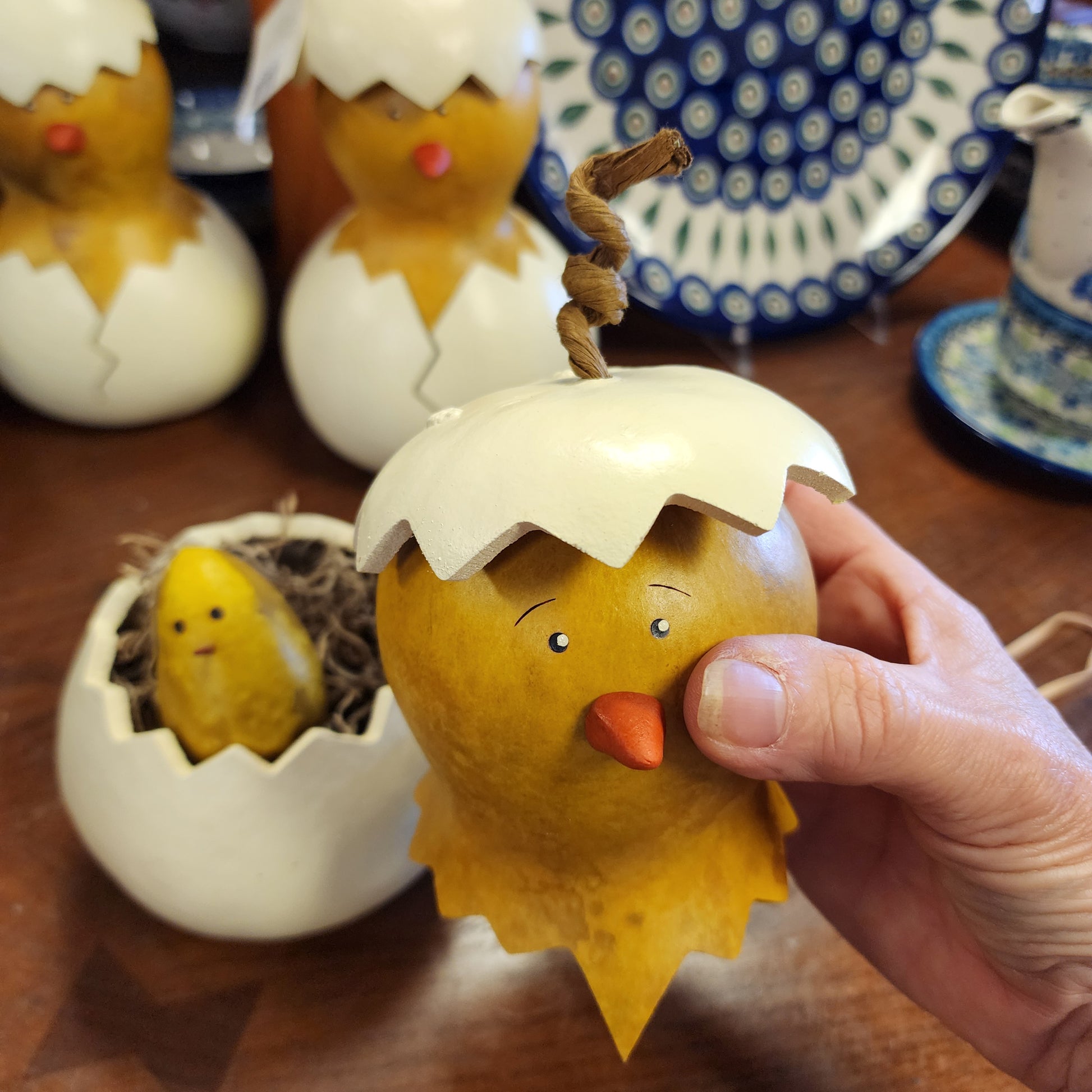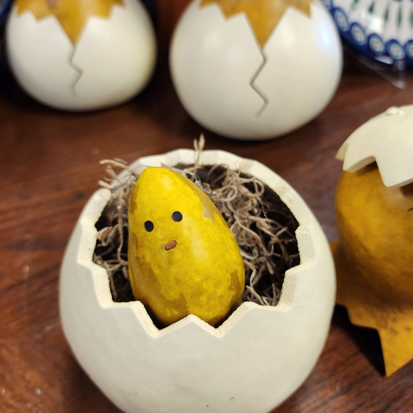 Our hen, Flora, is yellow on top with a white bottom. She opens and inside you’ll find a nest with an adorable baby chick. (similar to Matroyska stacking dolls)