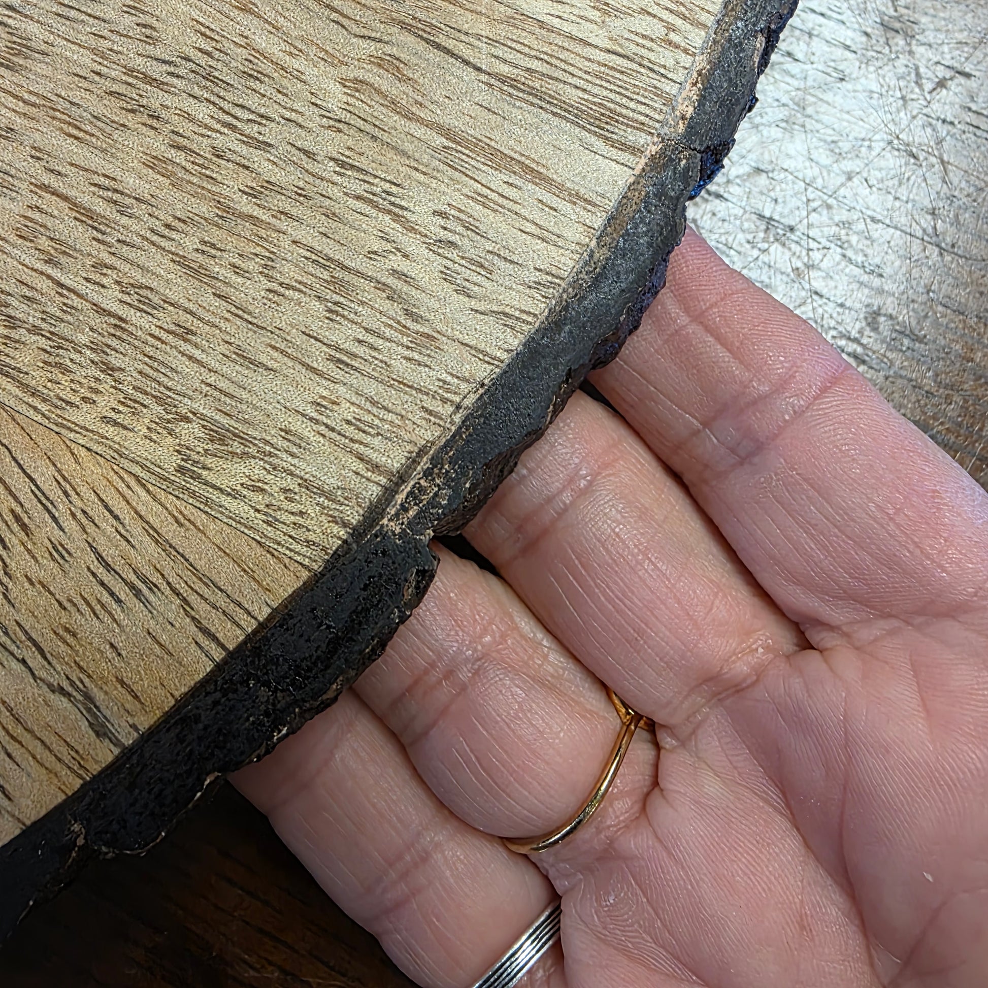 Lazy Susan Turntable is constructed of natural Mango Wood and features bark edging.
