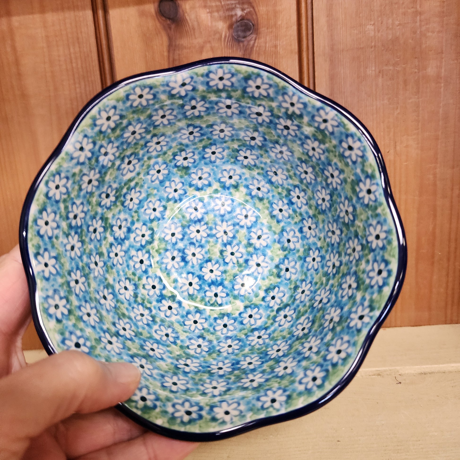 Polish PotteryBowl ~ Wavy Edge ~ 5.75" 2252X ~ Key Lime pattern. Handmade in Boleslawiec, Poland. We ship from Melbourne, Florida