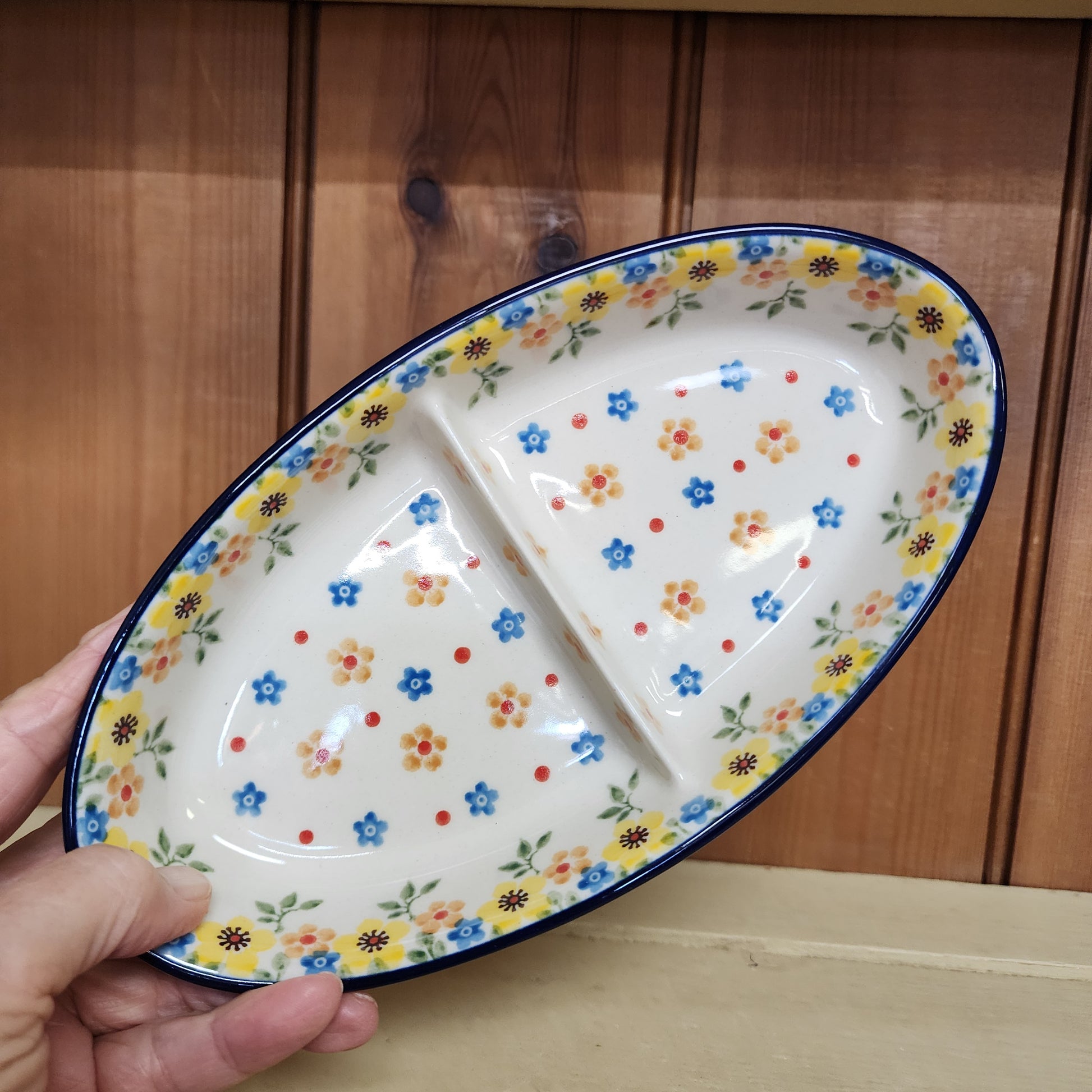 Polish PotteryDish ~ Divided Oval ~ Small 2225X ~ Buttercup pattern. Handmade in Boleslawiec, Poland. We ship from Melbourne, Florida