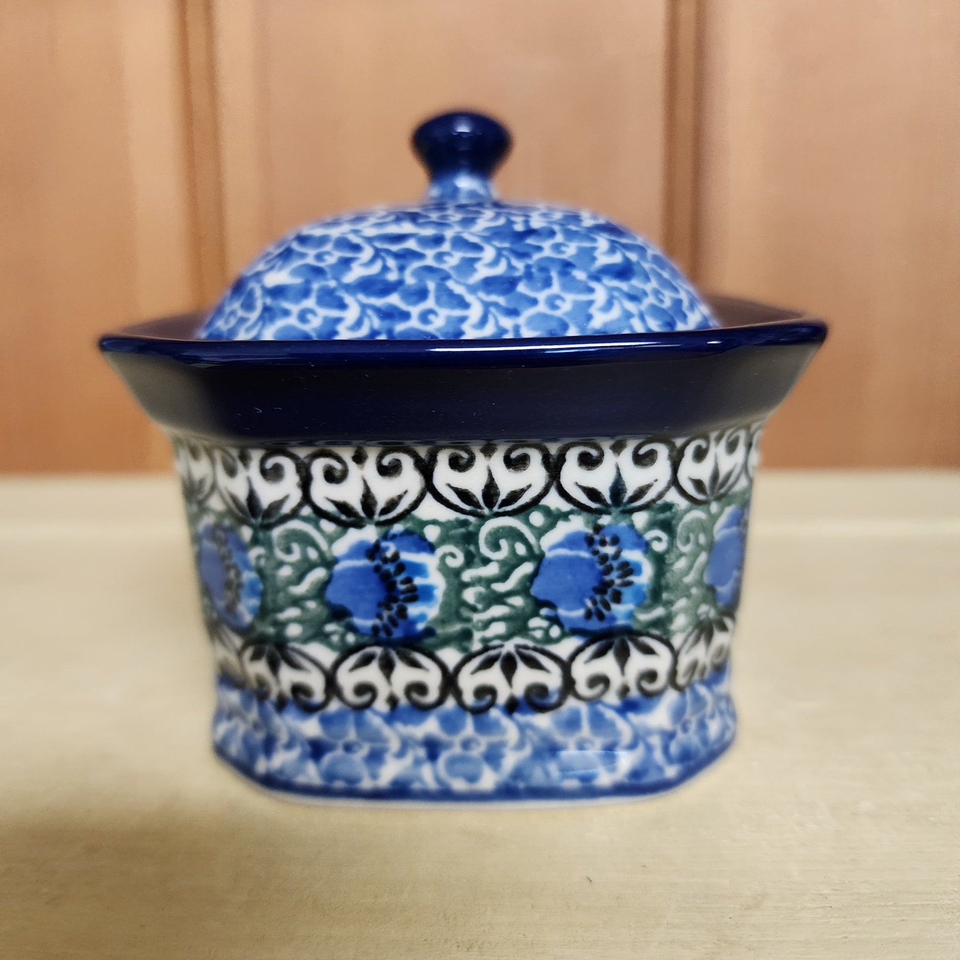 Polish Pottery Covered Container 3.25"H x 3.5"W x 4.5"L 1513X ~ Peacock Feather