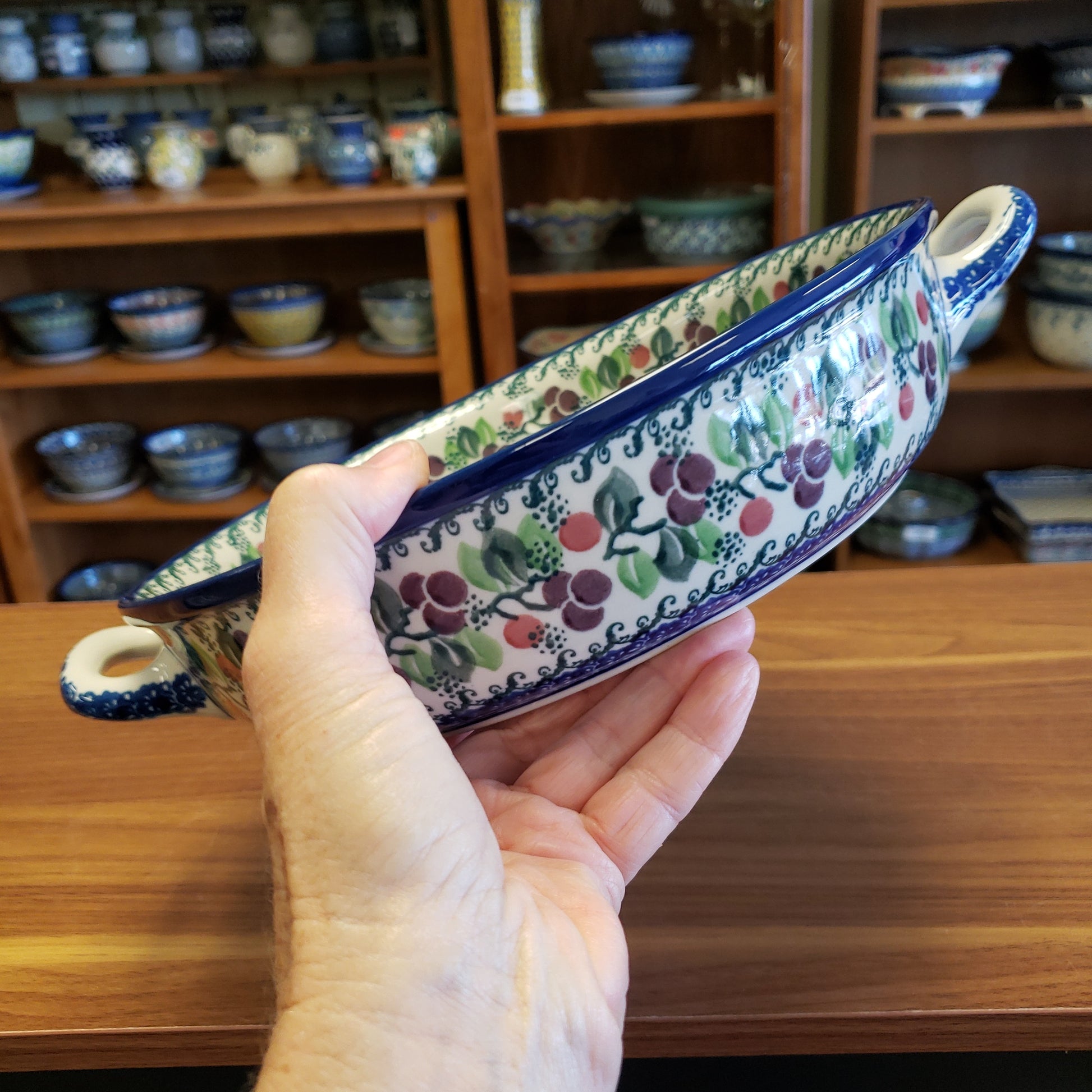 Polish Pottery Baker ~ Round w/ Handles ~ 10" 420-1418X ~ Burgandy Berry Blue