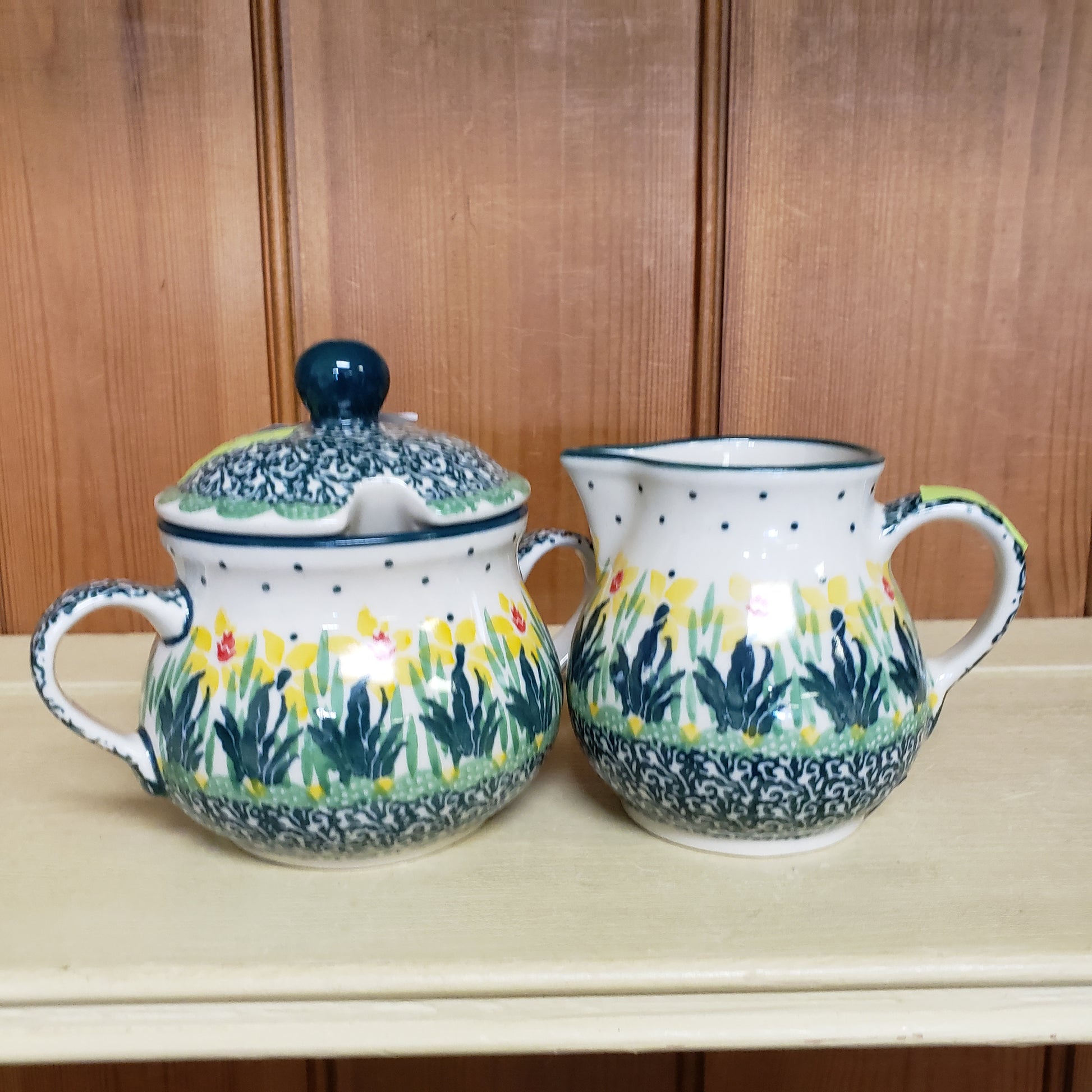 Polish Pottery sugar bowl w/lid (slotted) and 9 oz creamer
