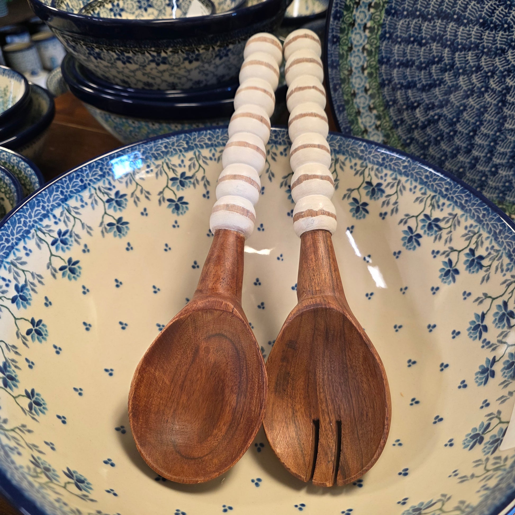 Includes one spork and one spoon. Stylish tool set for presenting and serving salads at the dining table or during special occasions. Beaded Handles provide a comfortable grip while serving. Set measures 12” x 6” x 1.5”.